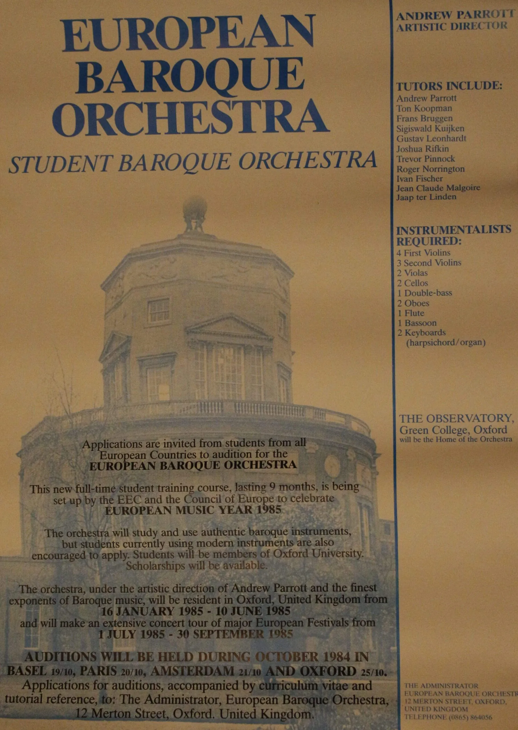 The EBO was founded by Paul James as part of the European Year of Music, celebrating the 300th anniversary of three great Baroque composers: Bach, Handel, Scarlatti. Musicians from across the European Community gathered in Oxford for what was conceived as a one-year project.